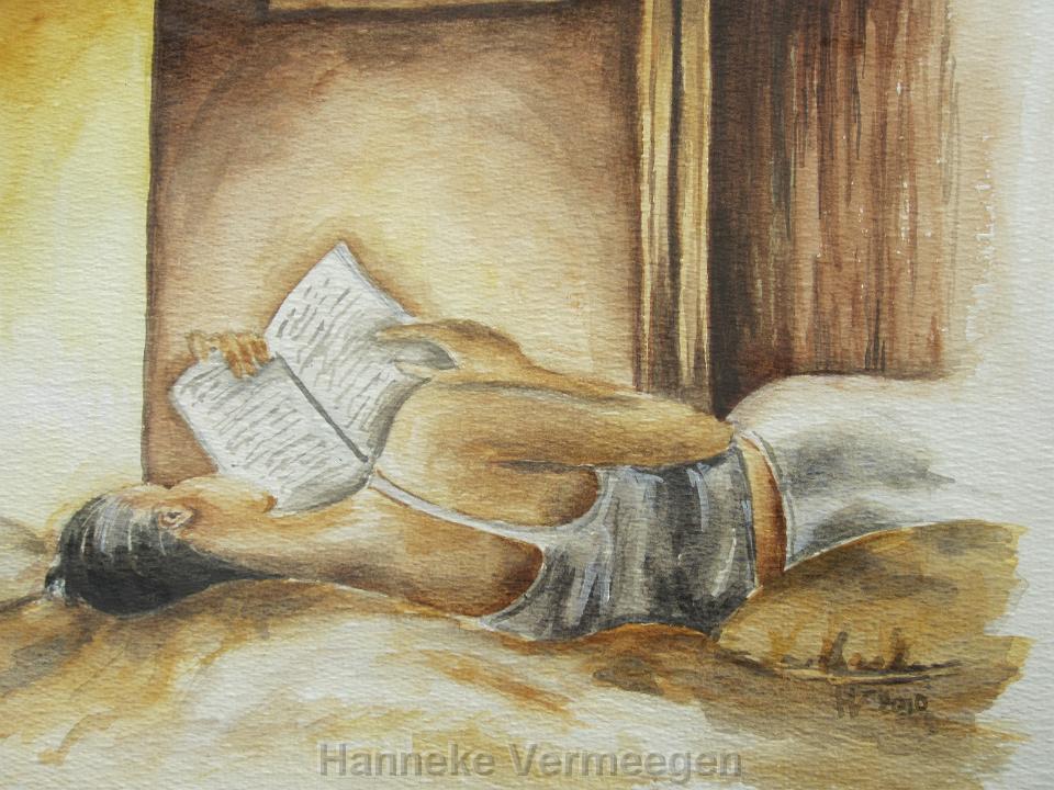 Privebezit-Vrouw in slaapkamer, aquarel